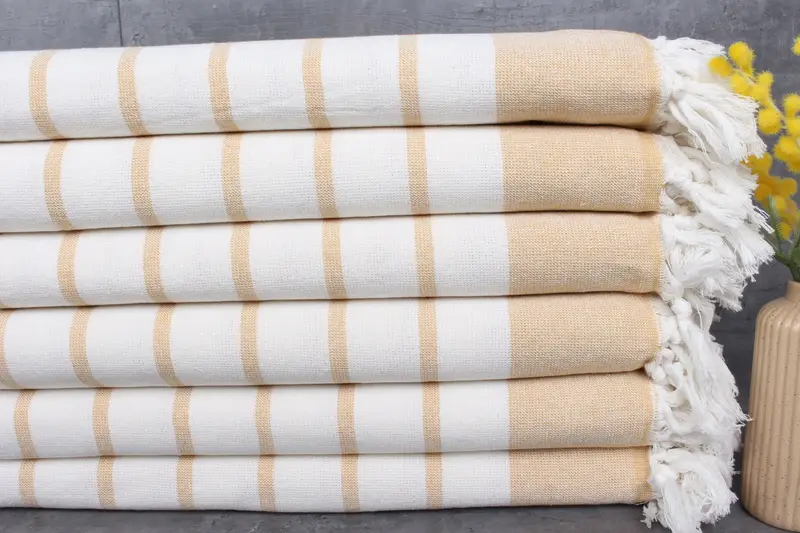 The product comprises 100% organic Turkish cotton, ensuring maximum absorbency and durability. Resulting in a towel weighing 422 grams, the fibers measure 39x67 inches or 98x170 centimeters. Hand-weaving tolerances may vary by 1-2.5cm.