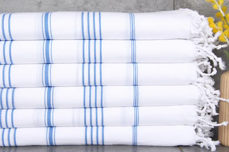 Constructed from 100% organic Turkish cotton, the Turkish beach towel ensures high absorbency and softness. Each towel is hand-loomed, resulting in towels with dimensions of 40x71 inches (100x180 centimeters) and a weight of 300 grams per square meter, with a tolerance of 1-2.5cm in dimension due to hand-weaving.