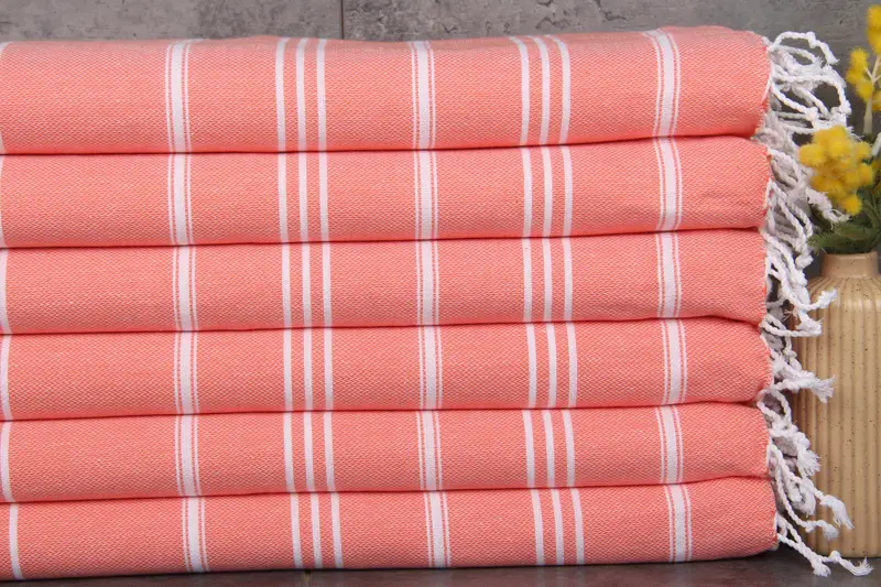 The Turkish towels are characterized by their high-quality 100% organic Turkish cotton, ensuring a natural dye process and superior absorbency. Resulting in towels with increased water absorption capabilities after each wash. The towels exhibit dimensions of 24x40 inches or 60x100 centimeters, with a weight of 100 grams per square meter. Hand-weaving tolerances allow for variations of 1-2.5 centimeters.