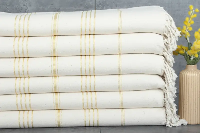 The Turkish towels and blankets are characterized by their fiber composition, consisting of 100% organic Turkish cotton, ensuring natural color dyeing. Resulting in a lightweight, 280 grams blanket and towels sized at 100x180 centimeters, these products are crafted with a hand-weaving process that tolerates variations of 1-2.5 centimeters. Each towel, blanket, or hand towel is pre-shrunk, enhancing durability and maintaining their fluffy texture after multiple washes.