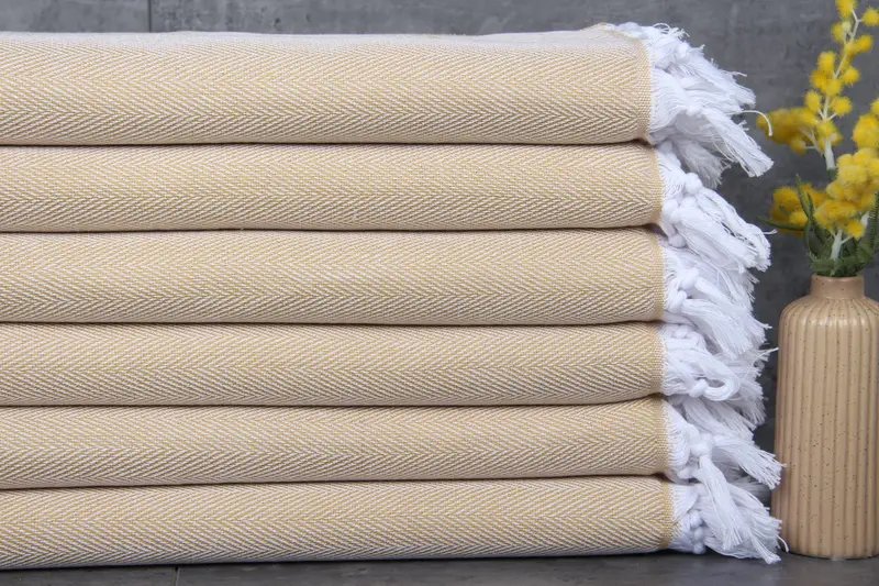 Turkish towels and blankets are characterized by their high-quality organic cotton, providing a softer texture and superior absorbency. Ensuring 100% organic Turkish cotton composition, these products measure 18x34 inches or 45x85 centimeters, with a weight of 120 grams per piece. The hand-weaving process results in a tolerance of 1-2.5 cm.
