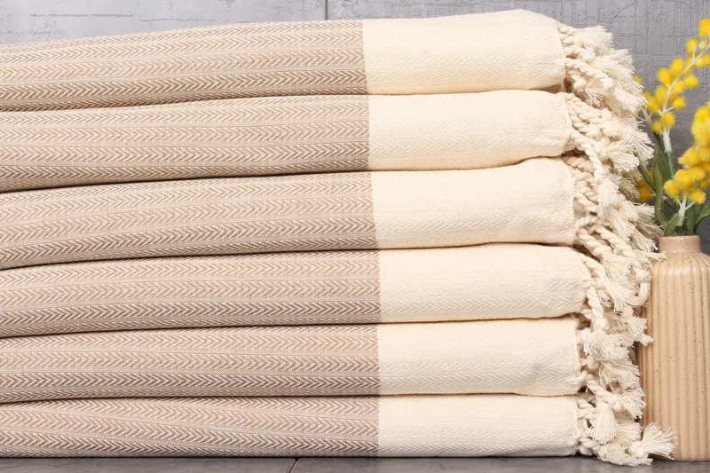 Turkish towels are composed of 100% organic Turkish cotton, resulting in natural color hues. Each piece weighs 420 grams and measures 36x67 inches (90x170 centimeters). Manufacturing involves hand-weaving with tolerances of 1-2.5 cm, ensuring variability.