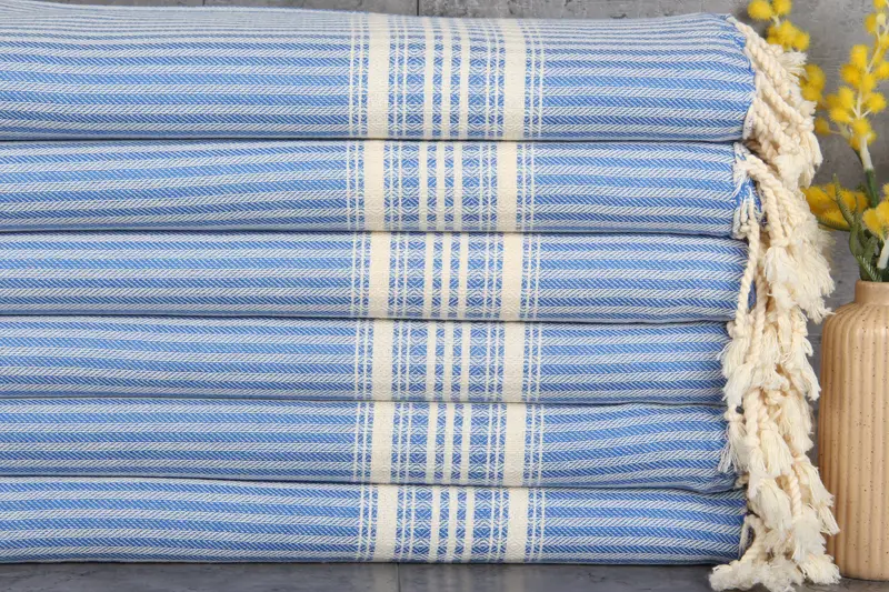 Characterized by a premium blend of 100% organic Turkish cotton, these towels are naturally dyed, ensuring a gentle touch and vibrant colors. Resulting in a substantial weight of 290 grams, the towels measure 67x38 inches or 170x95 centimeters, with hand-weaving tolerances of 1-2.5cm. Each piece is pre-shrunk and undergoes separate washing for the first 2-3 cycles to maintain absorbency.