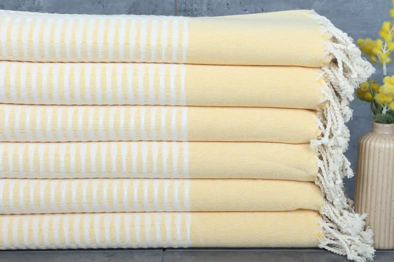 Crafted from 100% organic Turkish cotton, the towels are characterized by their natural dye hues and excellent absorbency. Ensuring durability, these towels weigh 380 grams and measure 70x36 inches (180x90 centimeters). Each piece undergoes a hand-weaving process with tolerances of 1-2.5 centimeters, resulting in a bespoke product.