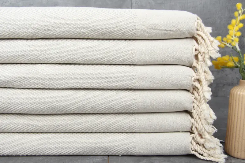Characterized by the use of 100% organic Turkish cotton, these towels and blankets ensure superior absorbency and durability. The towels weigh 150 grams, exhibiting robust fiber strength, and measure 24x44 inches or 60x110 centimeters. Natural dyeing processes enhance the aesthetic appeal, while hand-weaving allows for minor dimensional variations of up to 2.5 cm.