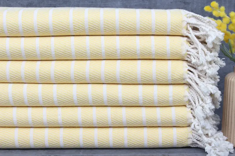 The Turkish towels and blankets are composed of 100% organic Turkish cotton, ensuring durability and softness. Characterized by their 40x71 inches or 100x180 cm size, these towels weigh 360 grams, resulting in a lightweight yet robust fabric. Variations in hand-weaving may result in dimensional tolerances of up to 1-2.5 cm.