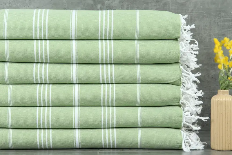 Turkish towels, made from 100% organic Turkish cotton, ensuring superior fiber composition and natural dye color retention. Characterized by exceptional absorbency, these towels weigh 265 grams and measure 40x71 inches (100x180 centimeters). Hand-woven with a tolerance of 1-2.5cm, they are designed for durability and comfort.