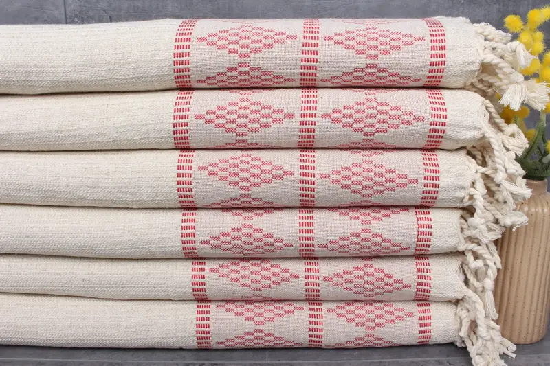 Turkish towels are characterized by their use of 100% organic Turkish cotton, dyed with natural colors, ensuring a high degree of breathability and durability. These towels exhibit an absorbency that increases with each wash, resulting in optimal functionality over time. Measuring 20x40 inches or 50x100 centimeters and weighing 120 grams, they offer a balanced combination of size and weight, with hand-weaving tolerances of 1-2.5cm.