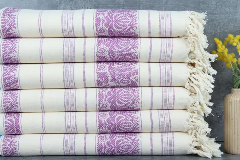 Organic Turkish cotton characterizes these towels, ensuring hypoallergenic properties and heightened absorbency. Towels exhibit dimensions of 40x66 inches or 100x166 centimeters, with a weight of 295 grams, resulting in durability and softness. Hand-weaving tolerances are within 1-2.5 cm, guaranteeing precision and quality.