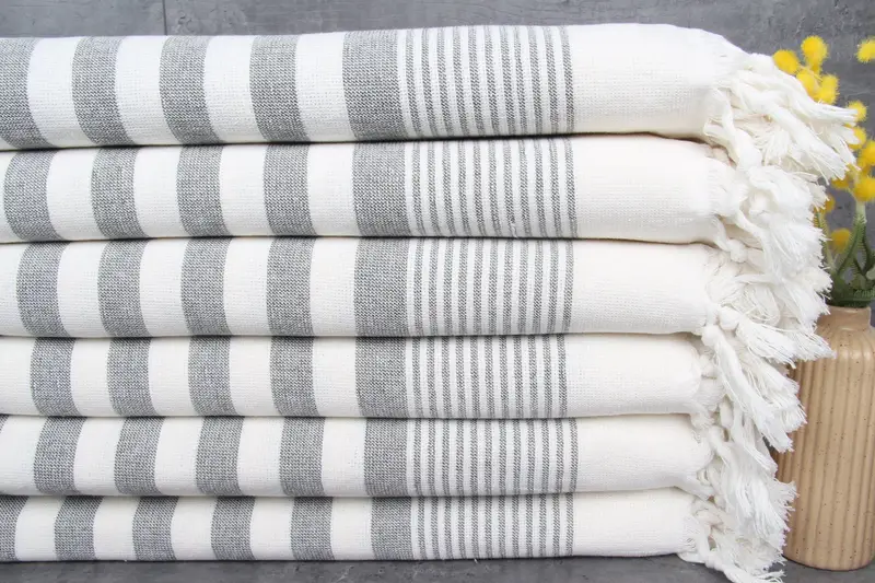 Characterized by %100 organic Turkish cotton, the towel ensures high absorbency, attributed to its natural dyeing process. Each towel exhibits a fiber composition with a weight of 410 grams, and dimensions of 40x67 inches, or 100x170 centimeters, with hand-weaving tolerances of 1-2.5cm.