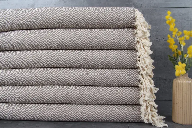 Organic Turkish cotton ensures superior absorbency. Weighing 400 grams, the towels provide adequate weight for various applications. Characterized by dimensions of 40x71 inches or 100x180 centimeters, these towels are versatile. Sub-category specifics include a brown diamond towel design. Each piece is hand-woven with a tolerance of 1-2.5 centimeters.