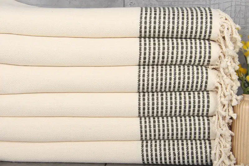 Turkish towels and blankets, characterized by their soft texture and durability, are woven from 100% organic Turkish cotton. This material selection ensures high absorbency and strength, resulting in towels that can withstand frequent washing. Dimensions for these towels are 36x69 inches (90x175 cm), with a weight of 460 grams, offering versatile utility in various settings.