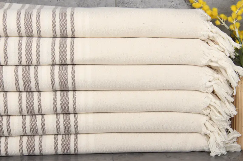 The Turkish towels are characterized by their 100% organic Turkish cotton composition, ensuring high absorbency and durability. Measuring 38x71 inches or 95x180 centimeters, these towels weigh 410 grams, providing a substantial weight that results in a plush texture. Crafted using hand looms, these towels exhibit a tolerance of 1-2.5 cm in dimension precision.