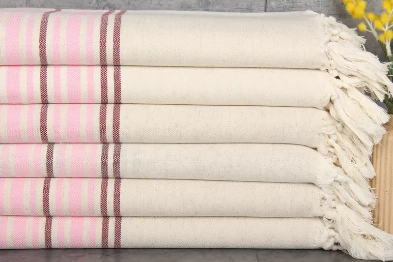 Turkish cotton towels are characterized by their 100% organic material, ensuring superior absorbency and softness. The towels measure 38x71 inches or 95x180 centimeters, with a weight of 410 grams. Hand-weaving tolerances may vary by up to 1-2.5 centimeters.