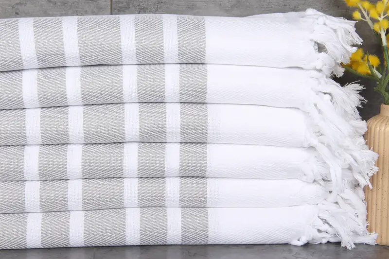 Organic Turkish cotton ensures premium quality and natural color in these towels. Characterized by 100% organic fibers, the towels measure 40x71 inches or 100x180 centimeters, weighing 380 grams. The hand-weaving process results in tolerances of 1-2.5 cm.