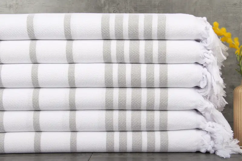 Turkish towels, renowned for their luxurious texture and durability, are crafted from 100% organic Turkish cotton. Ensuring high absorbency and softness, these towels are naturally dyed and pre-shrunk for optimal performance. Each towel measures 24x36 inches or 60x90 centimeters, weighs 120 grams, and allows for minor hand-weaving variations of 1-2.5cm.