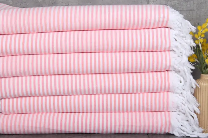 Characterized by organic cotton, Turkish towels are made from 100% Turkish cotton and dyed naturally. Resulting in increased absorbency after each wash, the towels' fibers expand to soak up more water. Ensuring durability, these towels measure 36x67 inches or 90x170 centimeters and weigh 200 grams.
