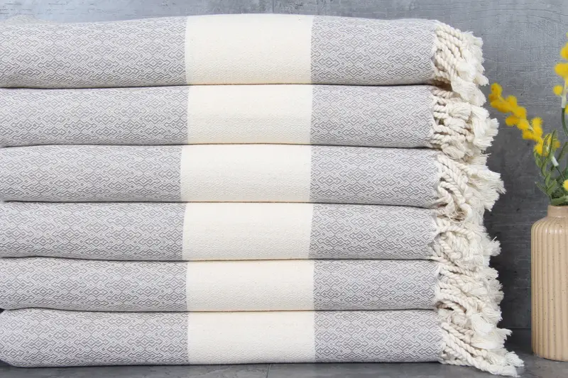 The Turkish towels are composed of 100% organic Turkish cotton, resulting in a weight of 340 grams and dimensions of 36x67 inches (90x170 centimeters). This natural fiber composition ensures high absorbency, enhancing with each wash. Each piece tolerates variations of 1-2.5cm in hand-weaving, adding to its artisanal quality.