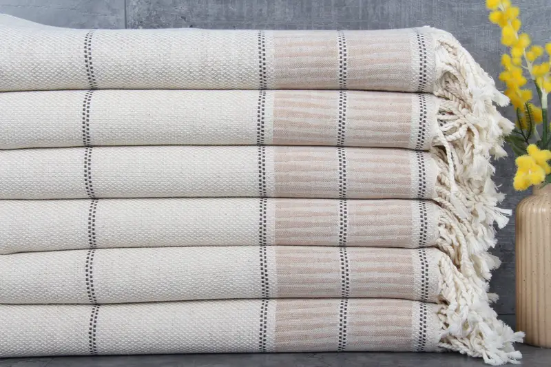 Organic cotton ensures a premium fiber composition for the towels, ensuring superior absorbency and durability. Resulting in towels weighing 340 grams, these Turkish bath towels feature a size of 40x71 inches or 100x180 centimeters, with hand-weaving tolerances of 1-2.5cm. Characterized by customization options, these towels can be embroidered as requested, and they are pre-shrunk to maintain their dimensions post-wash.