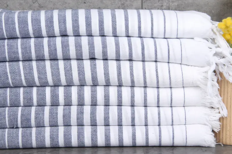 Turkish towels, characterized by their superior absorbency, are crafted from 100% organic Turkish cotton. The towels weigh 160 grams per square meter, ensuring they are lightweight yet highly absorbent. Resulting in dimensions of 36 by 67 inches or 90 by 170 centimeters, these towels are woven by hand, allowing for tolerances of 1-2.5 centimeters.