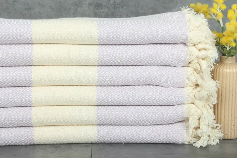 The towels and blankets are woven from 100% organic Turkish cotton, ensuring natural dyeing and high absorbency. Each towel and blanket weigh approximately 420 grams, with dimensions of 40x71 inches or 100x180 centimeters. The hand-weaving process results in a tolerance of 1-2.5cm in dimensions.