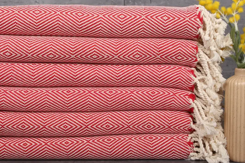 The Turkish towels are characterized by their pure organic cotton composition, ensuring high absorbency and durability. Weighting 456 grams, these towels measure 40x74 inches or 100x186 centimeters. Their hand-woven nature allows for a tolerance of 1-2.5cm.