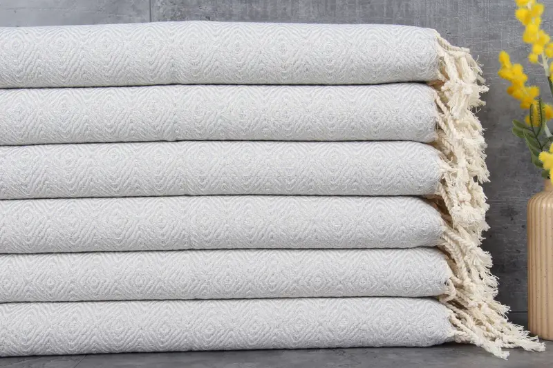 The product is characterized by its organic cotton composition, ensuring high absorbency and quality. Turkish towels are made of 100% organic Turkish cotton, with towels and blankets weighing 90 grams, and dimensions of 18x36 inches or 45x90 centimeters. The manufacturing process tolerates hand-weaving variations of 1-2.5cm.