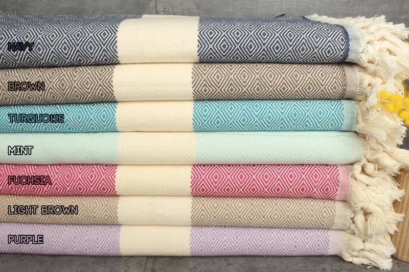 Characterized by a GSM of 300 grams/sq. meters, the Turkish towels are made from 100% organic Turkish cotton, ensuring superior absorbency and natural color hues. Organic cotton towels and throws have dimensions of 79x91 inches or 200x230 centimeters, with hand-weaving tolerances of 1-2.5 cm. Absorption properties improve with each wash, enhancing utility.