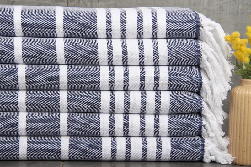 Turkish towels are meticulously woven with 100% organic Turkish cotton, ensuring durability and natural absorbency. The towels exhibit a consistent weight of 110 grams and feature dimensions of 20x40 inches (50x100 centimeters), offering ample utility in various contexts. Each hand-woven towel maintains a tolerance of 1-2.5cm, resulting in a high-quality finish.