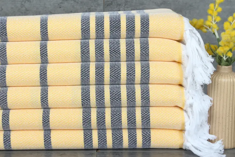 Ensuring optimal absorbency, the 20x40 inches yellow-black cotton tea towel is made from 100% organic Turkish cotton. Characterized by natural dyeing, the towel has a sub-category of Kitchen & Tea Towel, with secondary color beige. Weighing at 110 grams, the towel measures 50x100 centimeters. Pre-shrunk status of the hand-woven product results in tolerances of 1-2.5 cm.