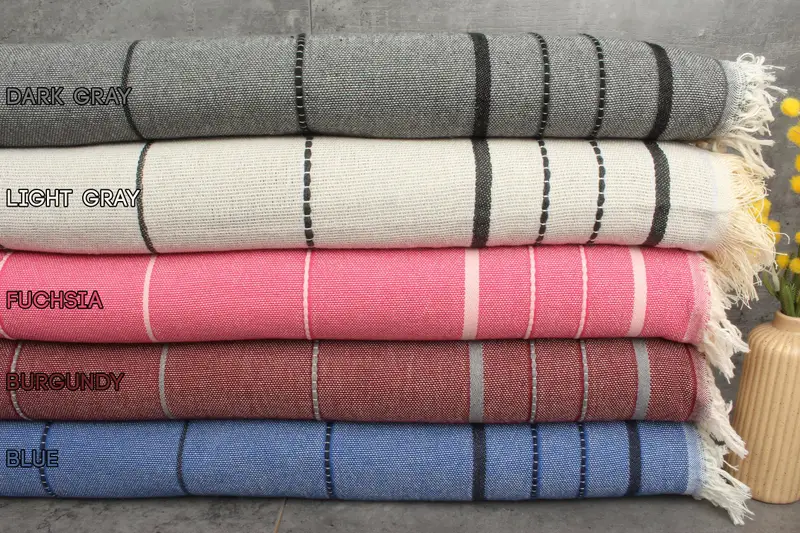 Turkish towels, blankets, and hand towels are crafted from 100% organic Turkish cotton, ensuring natural dyeing and enhanced absorbency. Characterized by an 82x99 inches/210x250 centimeters dimension and a weight of 240 grams/sq. meters, these items exhibit a 1-2.5cm tolerance for hand-weaving variations.