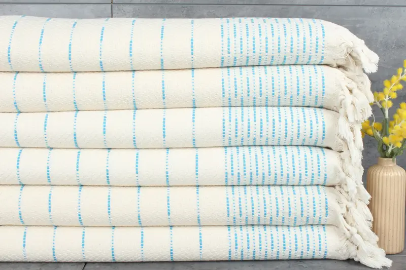 Comprised of 100% organic Turkish cotton, the blanket ensures high absorbency and softness, resulting in optimal utility for diverse applications. Each blanket exhibits precise dimensions of 91x97 inches, equivalent to 230x245 centimeters, with a weight of 1220 grams. Variations in hand-weaving techniques may cause slight tolerances within the 1-2.5 cm range.