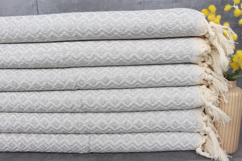Turkish Towels are renowned for their 100% organic Turkish cotton composition, ensuring a natural dye process, and resulting in vibrant colors. Characterized by high absorbency, these towels measure 18x36 inches or 45x90 centimeters, weighing approximately 120 grams. Hand-woven with tolerances between 1-2.5 centimeters, each piece maintains consistent quality.