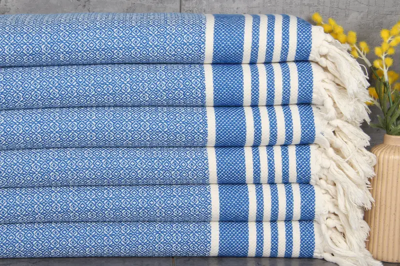 Turkish towels are distinguished by their organic cotton composition, ensuring high absorbency and durability. Characterized by a weight of 100 grams per square meter, these towels are woven with precision, resulting in a tolerance of 1-2.5 cm per side. Each towel measures 16x32 inches or 40x80 centimeters, crafted to meet diverse utility needs.