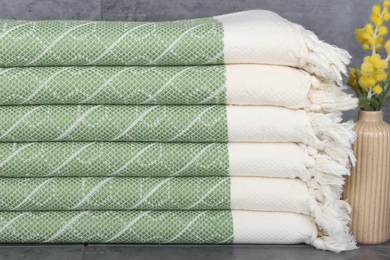 Each Turkish towel is characterized by its fiber composition of 100% organic Turkish cotton, ensuring superior absorbency and a natural, soft texture. The towels exhibit dimensions of 36x18 inches or 45x90 centimeters, accompanied by a weight of 120 grams. The manufacturing process allows for hand-weaving tolerances within a range of 1-2.5 centimeters, resulting in uniformity across the product batch.