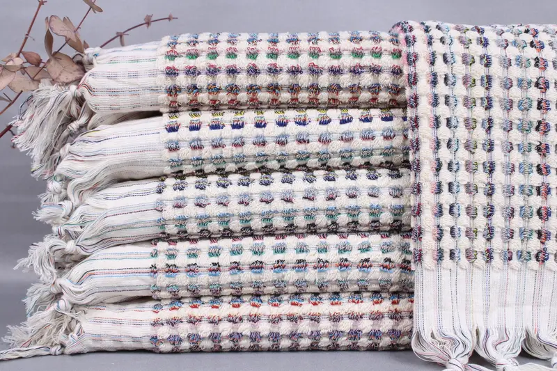 Organic Turkish cotton constitutes the fiber composition of these beach towels, ensuring high absorbency and a soft texture. Each towel measures 20x40 inches or 50x100 centimeters, with a weight of 250 grams, resulting in a lightweight yet robust fabric. Hand-weaving introduces tolerances of ±2 inches or 5 centimeters.
