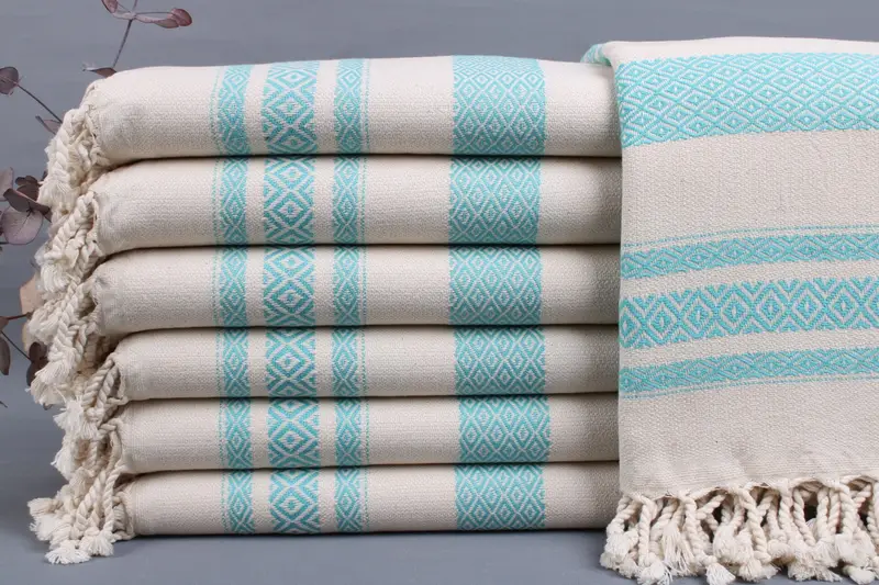 These towels are characterized by their organic Turkish cotton composition, ensuring superior absorbency and durability. Resulting in plush texture, they are made from 425-475 grams of material, presenting a weight balance conducive to various uses. Dimensions are specified as 40x70 inches or 100x180 centimeters with a tolerance of ±2 inches or 5 centimeters due to hand weaving.