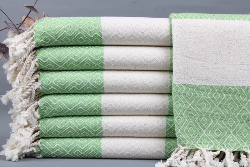 Each listing includes products such as Turkish bath towels, beach towels, and hand towels, woven from organic Turkish cotton, ensuring high-quality absorbency and durability. The towels are meticulously crafted on looms, resulting in dimensions of 38x67 inches or 95x170 centimeters with a tolerance of ±2 inches or 5 centimeters. They weigh between 325-375 grams, delivering a consistent feel after each wash.