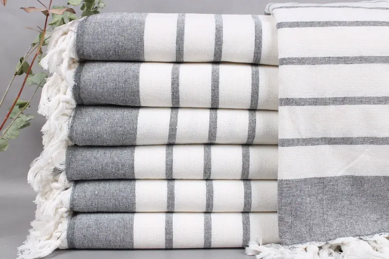 All beach towels and blankets are woven from organic Turkish cotton, ensuring high absorbency and durability. Each piece measures 40x67 inches or 100x170 centimeters and weighs 422 grams, with weaving tolerances of ± 2 inches or 5 centimeters. Personalization options include embroidery or monogramming with customer-specified letters, names, or logos, placed in recommended areas for maximum visibility.