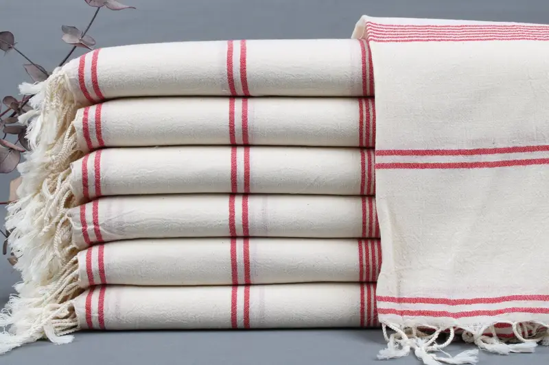 Woven from organic Turkish cotton, these beach towels are characterized by their high absorbency and softness, resulting in optimal utility across various settings. Measuring 40x70 inches or 100x180 centimeters, each towel weighs between 425-475 grams and is hand-woven with a tolerance of ±2 inches or 5 centimeters.