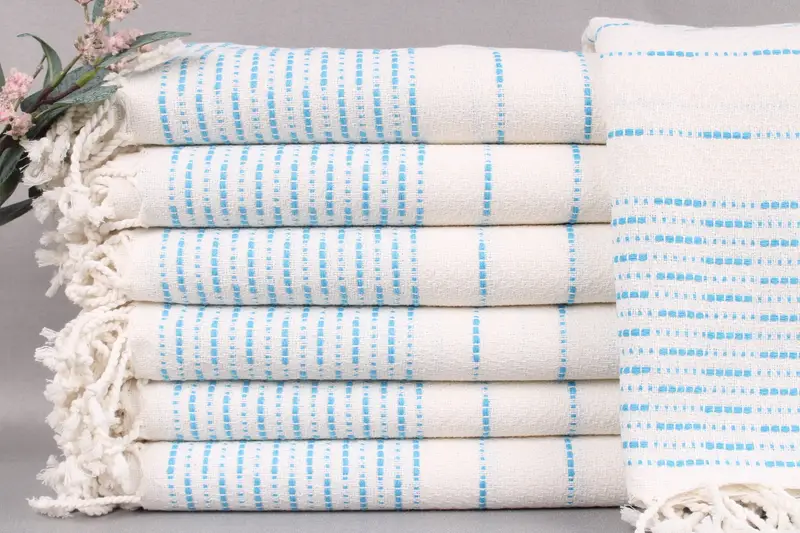 Organic Turkish cotton ensures superior absorbency, characterizing the Turkish Beach Towel. Fabric dimensions measure 38x71 inches or 95x180 centimeters, with a tolerance of ±2 inches (±5cm) due to weaving. The towel weighs 420 grams, providing durability and comfort.