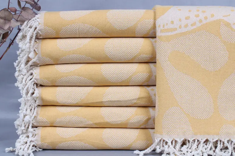 Organic Turkish cotton ensures high-quality fibers resulting in superior absorbency and durability. Each towel measures 40x71 inches (100x180 centimeters) with a tolerance of ± 2 inches or 5 centimeters. Weighing 450 grams, the towels are crafted through traditional hand-weaving techniques.