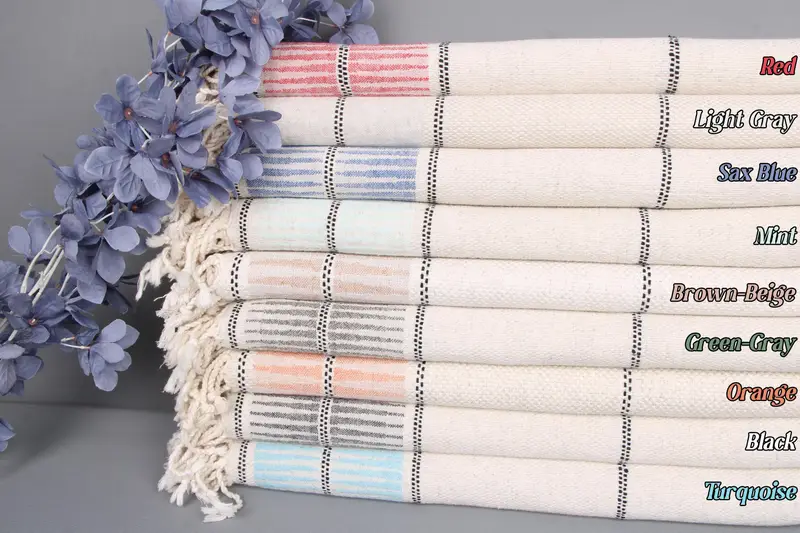 Turkish Towels are characterized by their linen fiber composition, ensuring excellent absorbency and durability. Each towel is woven from organic Turkish cotton on hand-operated looms, resulting in an approximate weight of 340 grams. Dimensions are 70x40 inches or 100x180 centimeters, with a tolerance of ±2 inches or 5 centimeters due to the hand-weaving process.