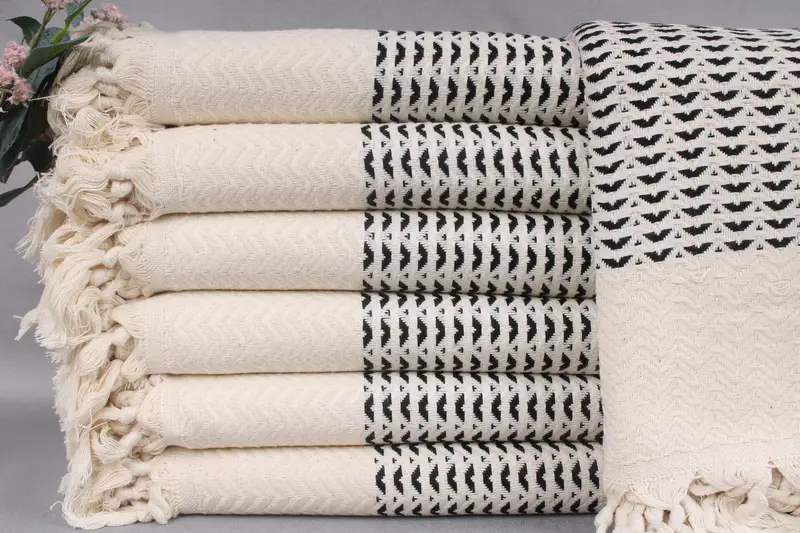 Each towel, blanket, or hand towel is woven from organic Turkish cotton, ensuring high quality and durability. Characterized by soft and absorbent properties, these products undergo pre-washing to enhance their texture and functionality. The woven items exhibit a tolerance of ±2 inches or ±5cm due to the artisan hand-weaving process.