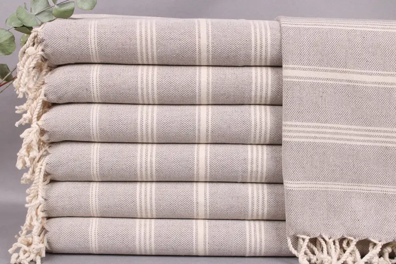 Turkish towels are woven from organic Turkish cotton, ensuring high absorbency and durability. Measuring 24x38 inches or 60x95 centimeters, each towel weighs approximately 100 grams, with a weaving tolerance of ±2 inches or 5 centimeters. These towels can be customized with embroidery or personalized names, offering flexibility for various uses.