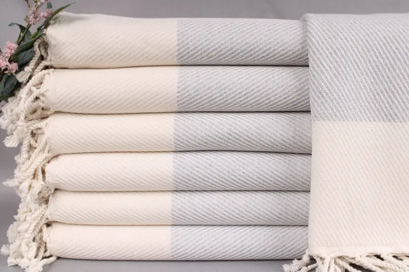 Woven from organic Turkish cotton, these bath towels ensure high absorbency and durability. Resulting in a lightweight yet robust texture, each piece is 40x71 inches (100x180 cm) with a weight of 430 grams, allowing for a ± 2-inch (5 cm) tolerance due to hand-weaving.