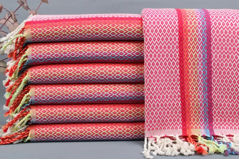 Organic Turkish cotton fiber composition ensures superior absorbency and softness, resulting in a premium quality towel. Characterized by dimensions of 40x71 inches (100x180 cm), the towels weigh between 425-475 grams, allowing for a hand-weaving tolerance of ± 2 inches or 5 cm. Each listing includes 1 towel, blanket, or hand towel.
