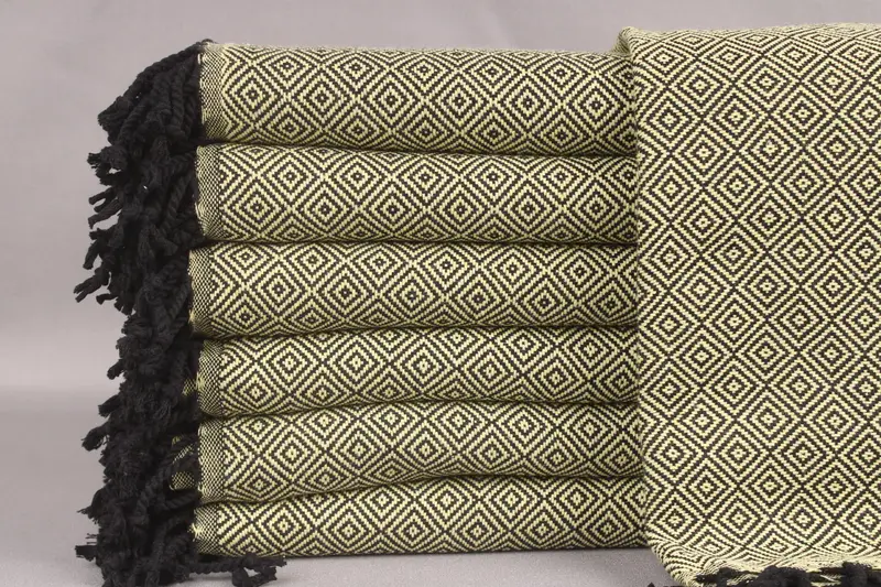Turkish beach towels are woven from organic Turkish cotton, resulting in high-quality and durable products. Characterized by their absorbency and gentle texture, each towel is handmade on looms, ensuring uniformity. Specifications include dimensions of 40x71 inches or 100x180 centimeters, a weight of 380 grams, and a tolerance of ±2 inches or 5 centimeters due to hand-weaving techniques.