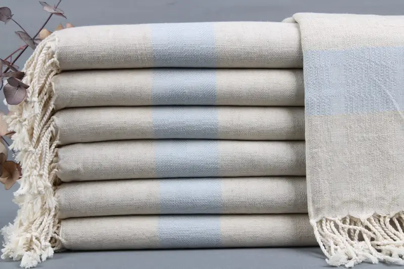 Organic Turkish cotton constitutes the fiber composition of the towels, ensuring high absorbency and durability. Characterized by a woven structure on looms, these towels exhibit variations within a tolerance of ± 2 inches or 5 centimeters. Each piece measures 36x71 inches (90x180 centimeters) and weighs between 275 and 325 grams.