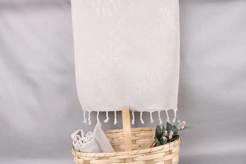 Fiber composition and absorbency are key characteristics of this product, ensuring it is made from organic Turkish cotton, which enhances its softness and durability. Dimensions are precise, with each towel measuring 18x36 inches, equivalent to 45x90 centimeters. Each product has a tolerance of ±2 inches or 5 centimeters due to the hand-weaving process. The weight of each towel is approximately 100 grams, resulting in a lightweight yet absorbent textile.